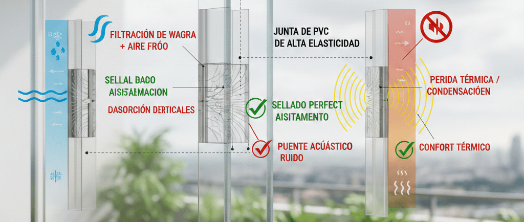 El desempeño de una cortina de cristal frente a filtraciones de agua, infiltraciones de aire, ruidos exteriores y variaciones térmicas depende en gran medida de la calidad, el ajuste y el estado de las juntas de PVC instaladas en el sistema. Para comprender este comportamiento, debemos considerar la interacción entre presiones dinámicas del viento, dilataciones térmicas del vidrio templado, tolerancias de montaje y distribución de cargas verticales y horizontales sobre las hojas móviles.