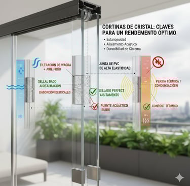 Es importante entender que la estanqueidad de un sistema de cortinas de cristal no depende únicamente de la junta en sí, sino de su interacción con la estructura completa del cerramiento: guías, remates laterales, perfiles de compensación y superficie del vidrio. Una junta mal instalada puede provocar desviaciones en el cierre, comprometer el funcionamiento de los carros o generar cargas irregulares que afecten la estabilidad del vidrio.